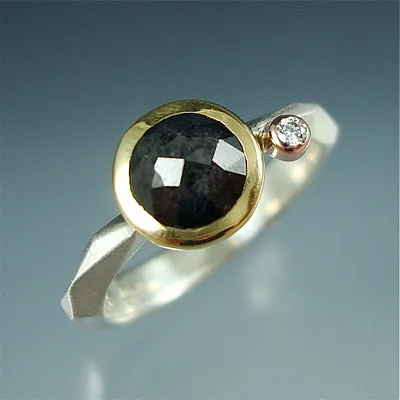 Rowena and Zack met while students at Oxford University. Originally from the States, Zack stayed on in London after grad school and two years later he popped the question at the couple’s favourite place, the tropical conservatory at the Barbican Centre in London. Zack wanted Rowena to choose a ring that was just right for her so he proposed with a little silver bow to remind her to go out and find her perfect ring. That’s where Danielle came in! She created a beautiful (and eminently wearable!) ring with a chiseled silver band, one large black rose cut diamond set in a 18k yellow gold bezel and the second tiny white brilliant cut diamond set in a 14k rose gold bezel.